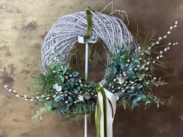 Jarný veniec s bahniatkami v prírodnom štýle 92x53cm