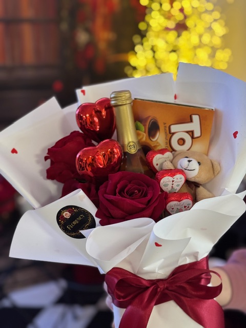 Kytica obsahuje: šampanské, čokoládu, macíka, ruže, srdcia, srdiečkové pralinky.