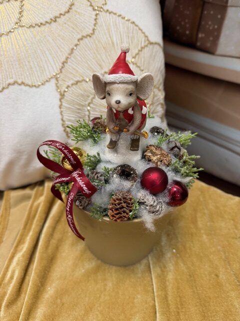 Vianočný aranžmán v zlatom črepníku s myšou 15x27cm