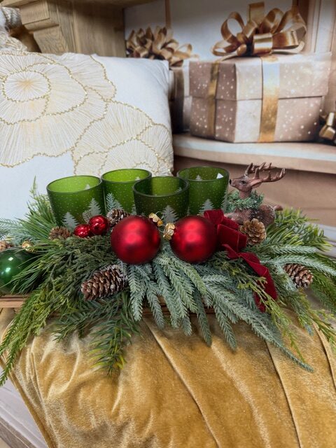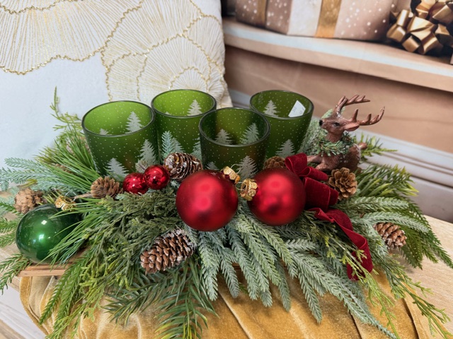 Zeleno-červený adventný aranžmán so sklenenými svietnikmi 65x36x19cm
